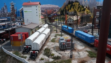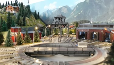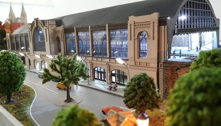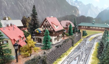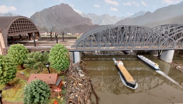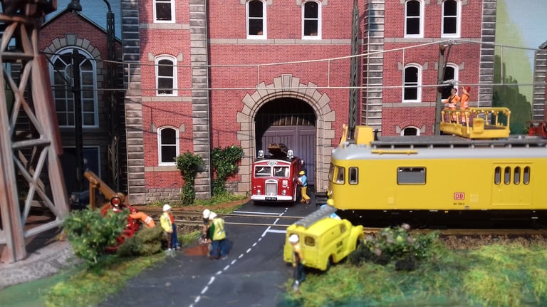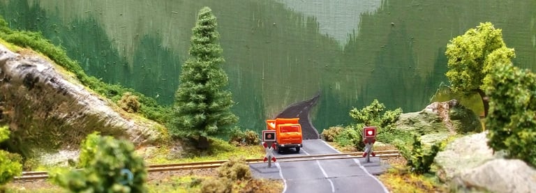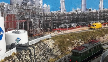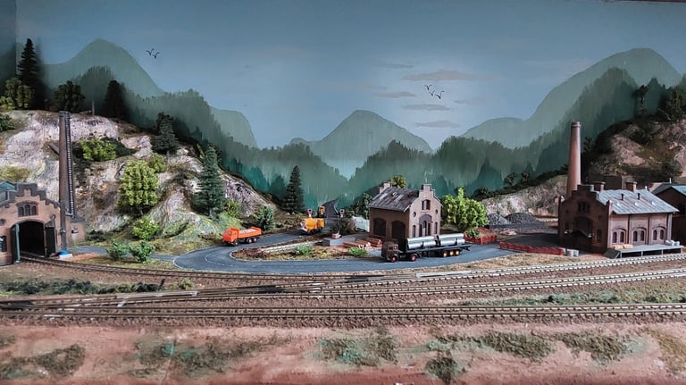 1.20mx40cm model on display representing a German factory environment. With 1 complete circuit and 3 parking branches, it has an electrified level crossing. Manual molding and decoration as well as background painting.