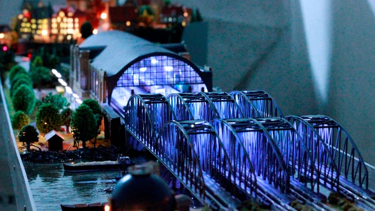 N scale diorama on display no larger than a shoebox. Buildings with cardboard facades, decorated and illuminated.