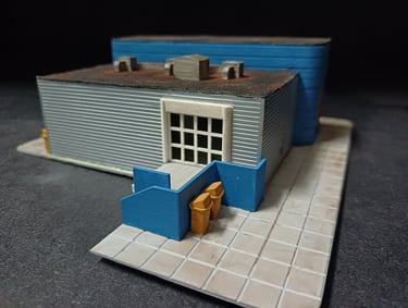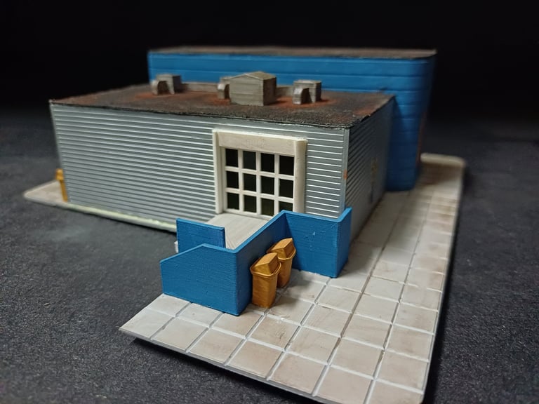 Totalmente construido de raiz este edifício é uma réplica do existente em Lisboa na zona da Rocha Conde Óbidos mas com a adição de acesso por via férrea de modo à perfeita integração na futura maqueta. Os detalhes apresentados, alguns de impressão 3D elevam o modelo a outro patamar com uma apresentação muito realística do que por lá se faz. Utilizado o material da Redutex, Evergreen, impressão 3D e acessórios vários sobras de outras construções. Iluminado no interior e exterior.