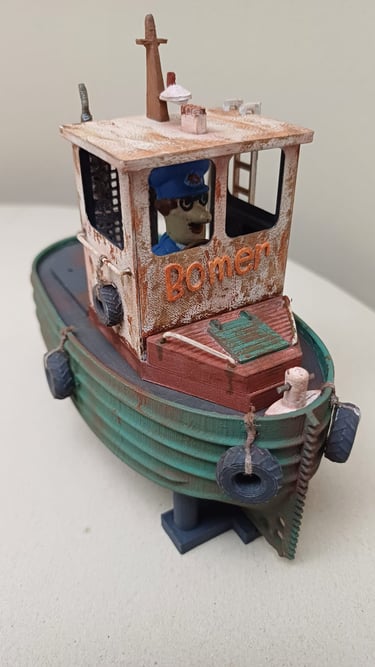 Este modelo foi impresso em 3D reduzido em escala, montado e decorado. Estes pequenos barcos são utilizados para organizar e empurrar os troncos de árvores abatidas que descem o rio e vão para as serrações à beira rio.