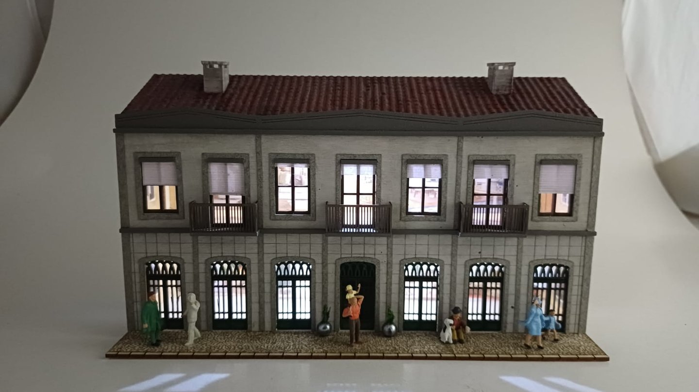 Built with laser cutting and 3D printing, this building is delivered assembled, painted, decorated and illuminated. Dimensions: 19cm wide, 8cm deep and 11cm high. (Figures not included) Ref. FA-001 Price: 100 eur