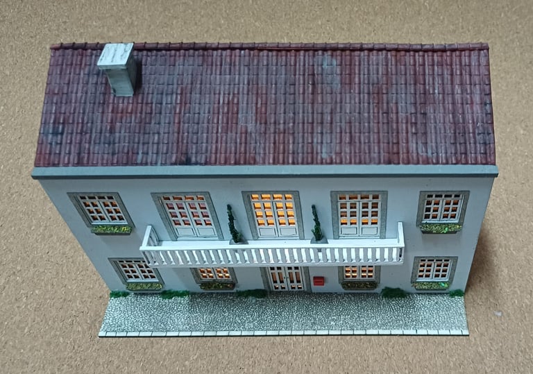 Built with laser cutting this building is delivered assembled, painted, decorated and illuminated. Dimensions: 15,4cm wide, 4cm deep and 9cm high. Ref. FA-009 Price: 45 eur
