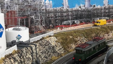 1.20mx40cm model on display representing a German factory environment. With 1 complete circuit and 3 parking branches, it has an electrified level crossing. Manual molding and decoration as well as background painting.