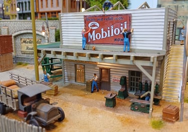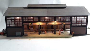 Este modelo foi construido à imagem de outros exemplos de construções que existem no continente americano e representa um negócio familiar com oficina na base e habitação no 1º andar. Feito inteiramente com Evergreen e madeira, montado, decorado e iluminado.