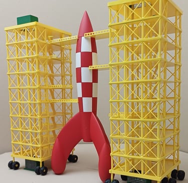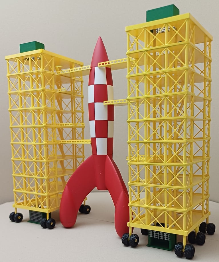 Projeto este bem desafiante, tendo o cliente o foguetão da história TinTin Rumo à Lua foi lançado o desafio de construir as 2 torres de apoio em escala Z para compor um cenário de estação terrestre espacial numa maqueta ferroviária na mesma escala. Foram utilizadas várias referencias do fornecedor Evergreen assim como impressão 3D para os "X" de proteção, caixas de elevador, escadas, varandins e rodas. O corte a laser foi aplicado para as plataformas e furos dos alicerces. Posteriormente pintado com spray.