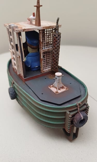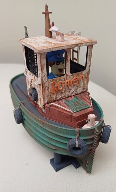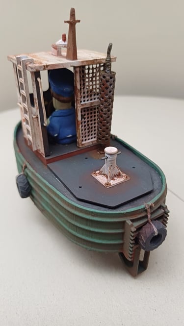 Este modelo foi impresso em 3D reduzido em escala, montado e decorado. Estes pequenos barcos são utilizados para organizar e empurrar os troncos de árvores abatidas que descem o rio e vão para as serrações à beira rio.
